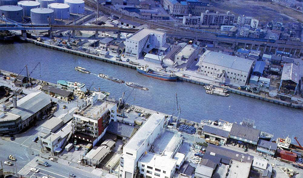 昭和45年(1970)、倉庫部門への進出し、安治川保税上屋開設(収容能力1,300㌧)と、本社々屋の隣に安治川倉庫(保税上屋596㎡)を建設し、昭和46年には海陸一貫輸送体制における物流拠点として大阪南港京浜バース市営上屋2棟(3,862㎡)並びに後背地に倉庫用地(2,969㎡)を確保し、大阪南港事務所を開設するとともに、富島保税上屋竣工。948㎡を設けました。倉庫部門はその後も昭和48年(1973)に大阪南港京浜バース後背地に第1倉庫(鉄筋4階建6,347㎡)建設。昭和49年(1974)に千葉県袖ヶ浦に同地区集荷ターミナルとして用地(7,159㎡)を確保し、鉄骨平屋建倉庫3棟、昭和51年(1976)に大阪南港第2倉庫(鉄筋3階建14,978㎡)、昭和59年(1984)に大阪南港第3倉庫(鉄骨平屋建2,000㎡)、安治川倉庫西側の鉄骨平屋建倉庫(270㎡)、昭和61年(1986)に南港南倉庫(鉄筋3階建3,362㎡)と南港中倉庫(鉄筋3階建8,159㎡)、平成3年(1991)に南港中央倉庫(鉄骨・鉄筋4階建6,649㎡)建設と続きました。