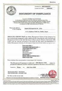 当社は、1997年10月 ISMコードの審査機関である(財)日本海事協会(Class NK)よりDOCを取得、1997年12月 昭晴丸(ケミカルタンカー)のSMCを取得しました。